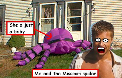 I was on a business trip in Missouri one time (Missouri state motto: “Where ARE we?”), and was standing in the reception area of the office when I saw the King Kong of all spiders.